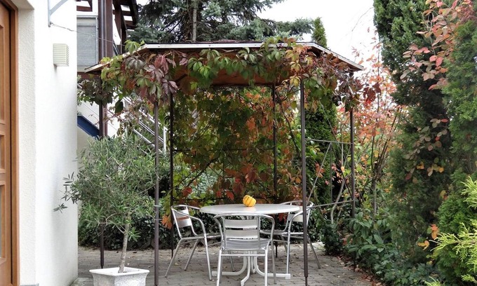 Our small ground floor apartment (35 sqm) features a bedroom with a double bed. From the dining area in the central living room with TV, you enjoy a wonderful view of Freiburg and the Black Forest mountains. The kitchenette is equipped with a stove with oven as well as a fridge with freezer compartment. The bathroom offers a shower, a washbasin and a toilet. For optimal comfort, the apartment is equipped with air conditioning. The apartment includes a covered pavilion with a seating area right next to the separate entrance door, from where you reach the courtyard garden area with barbecue corner and the adjacent vineyards.