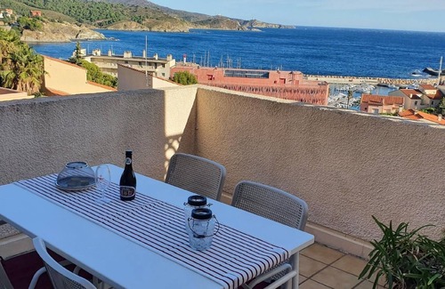 This studio apartment in an elevated location and with a great sea view is in Banyuls-sur-Mer in the south of France, just a few hundred metres from the sea.