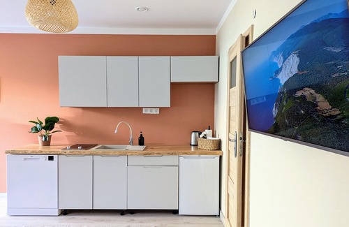 A cozy holiday resort right next to the Parsęta River. The area is quiet, just a few steps from the resort center. The beach is 650 meters away. The fish market, where you can buy fresh fish straight from the boat, is close by. This comfortable, spacious ground-floor apartment accommodates up to 4 people. It comprises a living room (TV, 2 fold-out sofas, table and chairs), a kitchen, a bedroom, and a bathroom with a shower. Central heating and Wi-Fi are available. The fenced grounds include a wooden cottage with a sauna, hot tub, and shower (for an additional fee). Secure parking, a summer kitchen with a barbecue and a large garden gazebo, and an attractive playground with a trampoline are available for children. A terrace with garden furniture is available for all guests. Direct access to the riverbank is available from the property, where you can relax on deckchairs or enjoy fishing. A rowing boat is also available for shared use by all guests (free of charge). Breakfast can be purchased on site. The price includes: bed linen, towels, electricity and water consumption, heating, final cleaning, internet, parking, a cot and high chair (requires prior reservation), and a rowing boat. The biggest attraction of Kołobrzeg is the wide, sandy beach. There are also numerous walking trails in the seaside park, along the seaside promenade, along the historic pier, and in the Old Town. The local lighthouse, oceanarium, seaport, and cathedral are all worth visiting. For families with children, we recommend the Pomerania Fun Park. This year-round park is located in the village of Dygowo (approximately 15 km from Kołobrzeg).