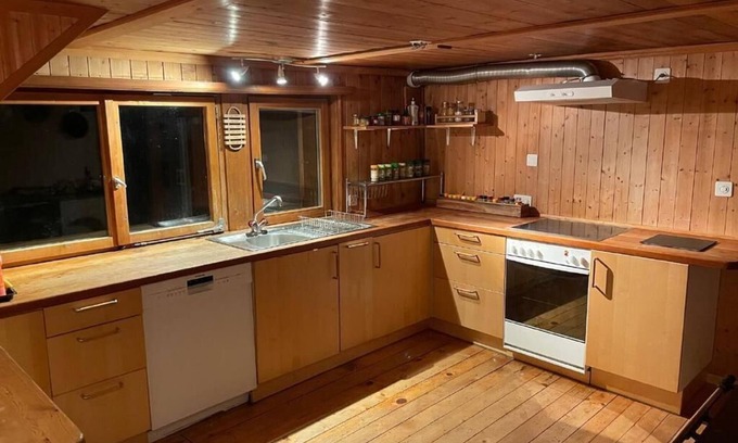 The kitchen is equipped with a stovetop, a refrigerator, and a dishwasher, as well as a coffee maker, cookware, and a toaster. And you won't have to pack extra clothes, because you'll also have a washing machine.