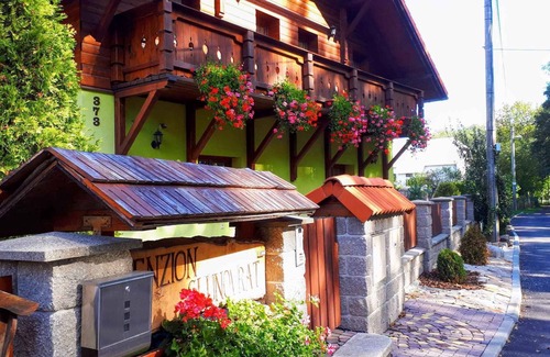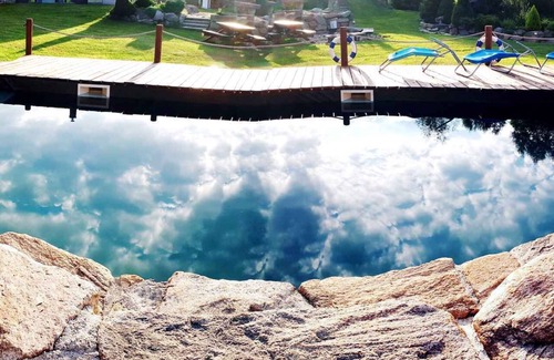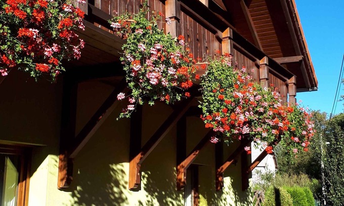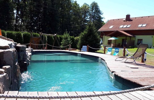 The holiday apartment is located in an apartment house, was renovated in 2010 and is furnished in a rustic style. The property is located on the outskirts. Also due to the view over woods from the property and its quiet and sunny location at the water the domicile is popular. Available for shared use: sunbathing lawn, parasol, sun lounger, children's playground, swing, sandpit, climbing frame, barbecue facilities, terrace, garden furniture and campfire site.LocationHroznětín, 500 m above sea level. The holiday apartement is located on a 2000 sqm enclosed garden plot with meadow, flowers and shrubs, bordered by a fence. The landlord lives permanently in the house, but uses a seperate entrance. The apartment is only suitable for families with children. Maximum of 4 adults and 2 children. Please order bed linen and cots when booking. There is also a holiday apartment CSR EZG 117 for 6 people in the house. Access is via a side road (asphalted). Parking (for 5 cars) is available on the street in front of the house. Specialcentral heating (gas), underfloor heating.Facilities: children's toys, baby cot, high chair and internet access (WLAN). TV reception takes place via satellite. PoolAll pools are available for shared use. Outdoor pool (usable from mid June to early September, 4 m x 10 m, depth 1,6 m). WellnessSauna. Leisuretable tennis. Dogsnot allowed. DistancesShopping 500 m, restaurant 200 m, town center 500 m. Hroznetin: discotheque 500 m and railway station 800 m. indoor swimming pool, sauna each 8 km in Jáchymov. thermal bath in Karlovy Vary 20 km. In summer: Bathing possibility 4 km in Merklín (beach 4 km in Merklín featuring meadow). horse riding in Dipoltovice 6 km. tennis in Hroznetin 500 m. mini golf in Jáchymov 8 km. golf in Karlovy Vary 20 km. fishing, boat rental each 4 km in Velky Rybnik. Natural lake 4 km In Velky Rybnik. In winter: Ski lift 6 km in Skiareal Plesivec. Ski area 6 km in Skiareal Plesivec (Skiareal Plesivec). ski rental, ski school each 16 km in Boží Dar. trail in Merklín 4 km. ice skating in Ostrov 7 km. Ski center Klinovec 6 km (lower ski lift - Jachymovska). Ski area 10 km in Pernink. Ski bus 200 m do Skiareal Plesivec. Ski bus 7 km from Ostrov to ski center Klinovec. DivisionHoliday apartment, 1 floor, 3 rooms (including 2 bedrooms), 105 sqm, in total 6 beds (including 2 additional beds), plus 1 baby cot. RoomThe entrance to your holiday apartment is located on the ground floor, is at ground level and with wardrobe. Living room (walk-through room) with sitting area, TV, fireplace, DVD player, dining area (6 seats) and access to the terrace (25 sqm, garden furniture, 1 table, 6 chairs). Bedroom with 1 double bed and 1 baby cot. Bedroom with 3 single beds and 1 additional bed on bunk bed (upstairs). Kitchen (12 sqm, walk-through room) with dining area (6 seats), electric stove (ceramic hob), oven, extractor hood, fridge (icebox), microwave, coffee machine, toaster, electric kettle and access to the terrace. Bathroom (20 sqm) with shower, 1 washbasin, WC and window. Terms of lease and pricesIncluded in the pricebabycot, internet access, parking place, pool, sunloungers, baby cot – please order at booking (under 2 years), Wireless Internet access. Side costs-Costs on the spot:/Obligatory:electricity 0,55 € per kilowatt hour based on usage. gas 1,50 € per cubic meter based on usage. water 4,50 € per cubic meter based on usage. final cleaning 39 € per object per stay. local tax by local tariff.On request:chimney wood 5 € per cubic meter based on usage. Laundry package (hand towels, bed linen - please order at booking) 8 € per person per first time use and changing. For a fee: sauna.Deposit:EUR 150,-/object
