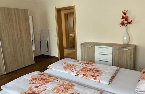This holiday apartment is on the first floor and was completely renovated in 2018, is approx. 85 square meters in size, offers enough space for 2-4 people and has: - a fully equipped kitchen (coffee maker, toaster, kettle, refrigerator, stove with oven, dishwasher and microwave) - separate dining room - separate living room with TV and pull-out sofa bed for 1 person - a bedroom with a double bed - a separate single room - a south-facing balcony - a newly renovated bathroom with shower and bathtub - as well as a separate toilet - free WiFi access We offer a bread roll service upon request. Our spacious garden with swings, sandpit and slide can be used and invites the whole family to linger. You are also welcome to spend cozy barbecue evenings with us in summer. (grill available) There are on-site and of course free parking spaces available. Our guests also have access to a washing machine and a dryer for €3.00 per use.