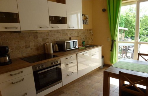 Beautiful holiday apartment with 2 separate rooms, hallway, kitchen, bathroom/WC and outdoor terrace. The apartment has been comfortably furnished and is located on the ground floor with separate access. The living room and bedroom are equipped with allergy-friendly laminate flooring and real wood furniture. Stereo system, satellite TV, DVD player and some board games are available for your entertainment. The kitchen has a modern fitted kitchen including an electric stove, microwave, refrigerator, freezer and dishwasher. The bathroom/toilet is tiled in a beautiful look. The real glass shower meets even the most demanding expectations. There is a cozy seating and barbecue area in the well-kept garden. Grill, garden furniture, etc. are available. A lockable bicycle garage and a parking space in the yard are also available to you.