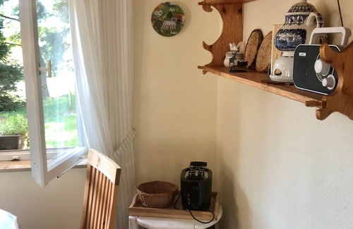 Basement apartment with garden, 54 sqm. Details: 1 separate bedroom. Layout: 1 bathroom, 1 bedroom, 1 living/sleeping room, 1 living room. Amenities: Baby cot on request, bed linen included, ironing facilities, garden view, garden furniture, towels included, heating, private entrance, smoke detector, sofa bed, Wi-Fi in the apartment, washing machine, tumble dryer in a separate room. Bathroom: window, shower, hairdryer, toilet paper. Pets: Allowed on request, no puppies, maximum 1 dog. Dogs may not be left alone in the apartment. Kitchen/dining area: oven, cutlery, dining area, dishwasher, barbecue, stove, high chair for children, coffee and tea facilities, coffee machine, separate kitchen, kitchen utensils, kitchenette, fridge, sink, freezer compartment, toaster, kettle. Media and technology: DVD player, radio, satellite TV, TV.