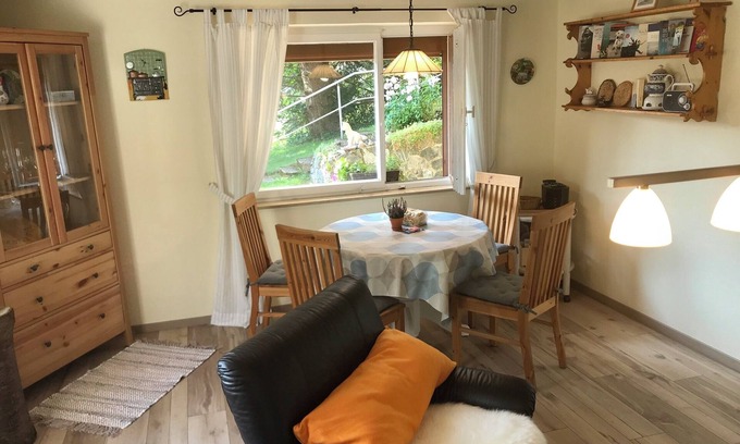 The accommodation is located in a rural area in the heart of the High Black Forest. For active guests, hiking and cycling trails such as the Rudenberger Forest and the Monastery Forest are available for outdoor activities directly from the house. Dogs are welcome, but only upon prior arrangement and may not be left alone in the holiday apartment. In the nearby town, about 3.5 km away, you will find souvenir shops, restaurants, cafés, supermarkets, cinemas, shopping facilities, a weekly market, banks, a train station, and bakeries. The ski areas in the High Black Forest can be reached by car in about 10 minutes. Excursion destinations such as Titisee, Feldberg, Schluchsee, or the Wutach Gorge are around 15 minutes away. Lake Constance, Switzerland, Alsace, and Europa-Park are about an hour away by car. The Robin holiday apartment (54 sqm) is barrier-free. The Melodie holiday apartment (42 sqm) has stairs.