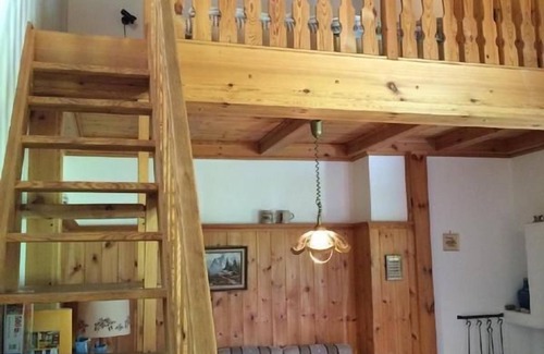 The cozy living room with wooden wall-panelling has a sofa, two easy chairs and a fireplace. The apartment offers free Wi-Fi and cable TV. The dining room has a Swiss stone pine table with corner bench and chairs. The bedroom has two beds with two single mattresses and a Swiss stone pine cabinet. The open gallery above the living room is accessible by internal staircase and is equipped with two beds with two individual mattresses and a Swiss stone pine wood cabinet.