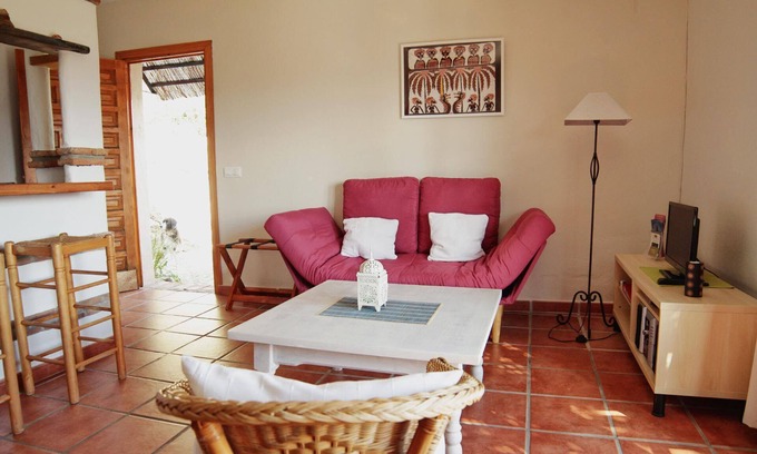 Double room with sitting area, TV, satellite, music, heating or fan. Two beds with natural latex mattresses and pure cotton sheets. Kitchenette with two-ring electric hob, toaster, blender, fridge and cooking utensils. Bathroom with shower, toilet and washbasin. Terrace with table, armchairs, sun loungers and barbecue.