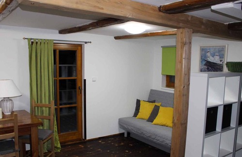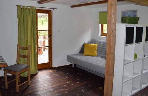 Your vacation object: The Holiday apartment is located on a 500 sqm and an open garden property with meadow, flowers and trees. The owner lives permanently in the house or, but uses a separate entrance. Relax outdoor with garden furniture. The playground with sandpit makes children's hearts beat faster. Barbecue possibilities are available. Your holiday apartment: Your holiday apartment offers 2 floors, 2 rooms (from which 1 bedroom), is 45 sqm and can accommodate up to 4 persons. On colder days your holiday apartment can be heated with central heating. Smoking is not permitted inside the rooms. The entrance is on the ground floor and ground level. The rooms are divided as follows:Ground floor: Living room / bedroom with TV. You have access to the terrace. Cooking nook in the living room / bedroom with dinette, electric cooker (2 plates), refrigerator, microwave, coffee machine and electric water boiler. Bathroom with shower, 1 washbasin and WC. Upper floor: Bedroom with 4 single beds and 1 baby bed. In addition, your holiday apartment is equipped with baby bed. TV or radio channel can be received per satellite. Pets: erlaubt, CZK 200.00/Tier und Tag.