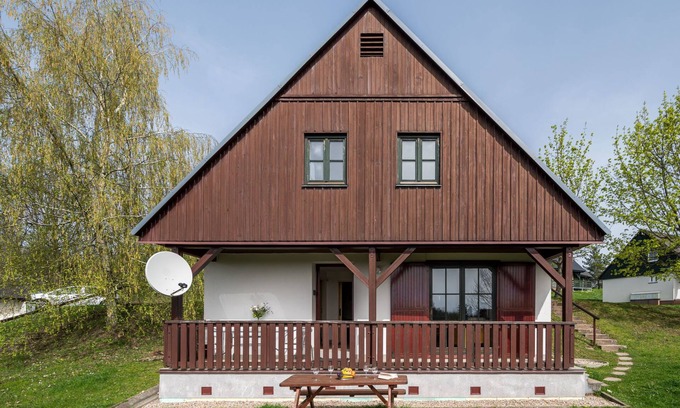 Čistá v Krkonoších 2 km from Černý Důl: Child friendly, beautiful, comfortable holiday village "Holiday Hill 30", 500 m a.s.l., surrounded by trees and meadows. 43 houses in the resort. On the outskirts, in a secluded, quiet, sunny position, 1.5 km from the lake, 3 km from the skiing area, in the countryside. For shared use: property 6 ha, meadow, swimming pool heated (9 x 4 m, depth 120 cm, seasonal availability: 15.May. - 30.Sep. pool opening hours: 09:00-20:00). Shower/WC in the pool area, table tennis, children's playground (swing). In the complex: reception, central heating system. Parking (for 2 cars) at the house. Shop 2.5 km, grocery 2.5 km, supermarket 7.5 km, restaurant 1.6 km, pub garden 400 m, bus stop "Černý Důl, Čistá-pošta" 400 m, grass beach 1.5 km (small), indoor swimming pool 19 km. Golf course (18 hole) 14 km, tennis 2.5 km, sports centre 2.5 km, walking paths from the house 100 m, cycle lane, ski lift 3 km, chair lift 3 km, slopes 3 km, ski school 3 km, children's ski school 3 km, sled run 7 km, cross country ski track 100 m. Nearby attractions: Janské Lázně Spa 9 km, Vrchlabí 10 km, Aquapark Trutnov 25 km, Zoo Safari Dvůr Králové 29 km, Bozkovské jeskyně 37 km, Adršpašské skály 44 km. Well-known ski regions can easily be reached: Černý Důl 3 km, Herlíkovice 15 km, Pec pod Sněžkou 22 km. Well-known lakes can easily be reached: Čistá 1.5 km, Vrchlabí 9 km. Hiking paths: Sněžka 25 km.