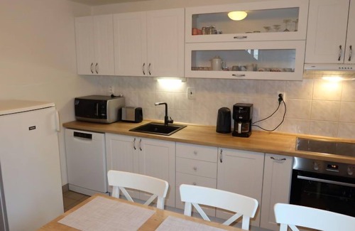 4-room house 100 m2 on 2 levels. Bright, comfortable and cosy furnishings: open living room with satellite TV. Exit to the terrace. Kitchen (oven, dishwasher, 4 ceramic glass hob hotplates, toaster, kettle, microwave, freezer, electric coffee machine) with dining table. Sep. WC. Upper floor: 2 rooms, each room with 1 double bed. 1 room with 1 bed and 1 double bed. Bath/WC. Large terrace 20 m2. Terrace furniture. Facilities: washing machine, baby cot. Internet (WiFi, free). Please note: suitable for families. Non-smoking house. Maximum 2 pets/ dogs allowed.