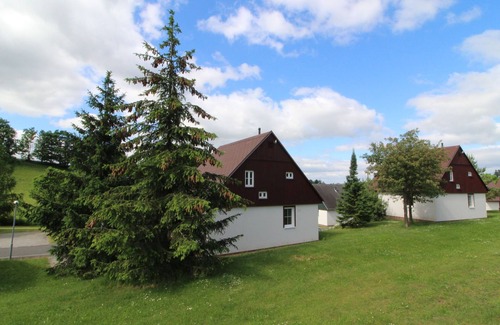 Čistá v Krkonoších 2 km from Černý Důl: Child friendly, beautiful, comfortable holiday village "Holiday Hill", 500 m a.s.l., surrounded by trees and meadows. 43 houses in the resort. On the outskirts, in a secluded, quiet, sunny position, 1.5 km from the lake, 3 km from the skiing area, in the countryside. For shared use: property 6 ha, meadow, swimming pool heated (9 x 4 m, depth 120 cm, seasonal availability: 15.May. - 30.Sep. pool opening hours: 09:00-20:00). Shower/WC in the pool area, table tennis, children's playground (swing, sandbox). In the complex: reception, central heating system. Parking (for 2 cars) at the house. Shop 2.5 km, grocery 2.5 km, supermarket 7.5 km, restaurant 1.6 km, pub garden 400 m, bus stop "Černý Důl, Čistá-pošta" 400 m, grass beach 1.5 km (small), indoor swimming pool 19 km. Golf course (18 hole) 14 km, tennis 2.5 km, sports centre 2.5 km, walking paths from the house, cycle lane 100 m, ski lift 3 km, chair lift 3 km, slopes 3 km, ski school 3 km, children's ski school 3 km, sled run 7 km, cross country ski track 100 m. Nearby attractions: Janské Lázně Spa 9 km, Vrchlabí 10 km, Aquapark Trutnov 25 km, Zoo Safari Dvůr Králové 29 km, Bozkovské jeskyně 37 km, Adršpašské skály 44 km. Well-known ski regions can easily be reached: Černý Důl 3 km, Herlíkovice 15 km, Pec pod Sněžkou 22 km. Well-known lakes can easily be reached: Čistá 1.5 km, Vrchlabí 9 km. Hiking paths: Sněžka 25 km. Please note: the photograph shows a typical example.