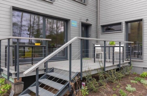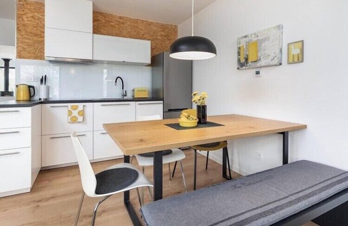 The intimate holiday resort (3 holiday homes) is located in an idyllic area, just 30 m from the shores of Lake Wisełka. You can find peace and quiet here, and in the immediate vicinity you can go for a walk or a trip on foot or by bike. A comfortable, two-story holiday home in a modern, Scandinavian style, with a large terrace overlooking the lake. A complete set of garden furniture awaits you on the terrace. On the ground floor there is a large living room with a fireplace (wood for an additional fee), satellite TV, 2 sofas and a table with chairs. An open, perfectly equipped kitchen. On the ground floor there is also a double bedroom and a bathroom with a shower. On the first floor there are another 2 bedrooms and a second bathroom with a shower. Electric heating (underfloor heating in the bathrooms). Wireless internet is available. The house is surrounded by a well-kept garden, and in it a free-standing sauna (additional fee). There is also a safe parking lot (2 spaces/house). You can rent a grill on site. The price of your stay includes: bed linen, electricity consumption (in the period 21.06 - 30.08), water consumption, internet, parking (2 spaces per house). Baby cot and high chair on request. 30 m from the holiday home there is a swimming area on the lake, with a small beach. Just 2.5 km away there is also a beautiful Baltic beach. On the other side of the lake (800 m walk) there is a water equipment rental (SUP, water bike, kayak, sailboat). In the center of the town, approx. 900 m from the holiday home, there are 2 grocery and industrial stores and several restaurants. There is also a bike rental. In the nearby area there is the Wolin National Park, with a bison reserve and many hiking and cycling trails.