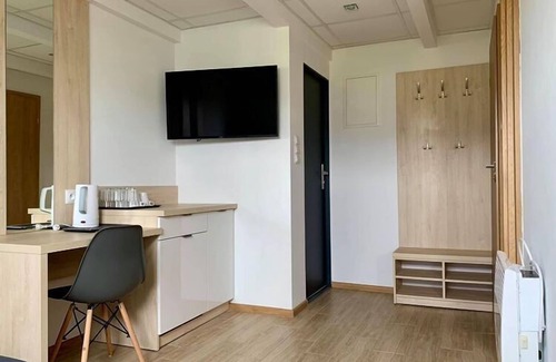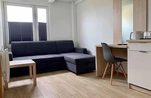 The recreation center is ideally located just 100 m from the seaside beach, next to a pine forest. The center of a quiet seaside settlement (Łazy), in close proximity to Lake Jamno. A cozy, single-story holiday home with a terrace. There is a set of garden furniture on the terrace. The house has 2 rooms. The living room (TV and table with chairs, fold-out 2-seater sofa) is connected to the kitchen. The bedroom has 2 single beds. Bathroom with shower. Electric heating in the bathroom. Wireless internet is available. The well-kept, fenced area of the center offers guests rich infrastructure: children's playground, parking lot, garden gazebo, table tennis, sports field, bicycle rental. Shared washing machine (for a fee). There is also a restaurant where you can order both breakfast and dinner. The price of the stay includes: bed linen, towels, water consumption, internet, parking, final cleaning. Baby cot and high chair (on request). Attractions in the area: The beautiful seaside beach is only 100 m away. In the immediate vicinity you can find many recreational facilities, restaurants and cafes. In the vicinity of the center there is the international bicycle route R-10, which allows you to easily and conveniently get by bike to other neighboring seaside towns: Mielno, Mielenko, Chlopy (a small, historic fishing village), Sarbinowo, Gaski. The center is located in the immediate vicinity of Lake Jamno. In neighboring Mielno you can rent water equipment (pedal boats, kayaks, rowing and sailing boats). There are also fishing spots here.
