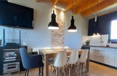 A family holiday resort on the edge of Mielno - a small, quiet seaside settlement, which is a quiet suburb of the more bustling resort of Mielno. The beach is 850 m away. The quiet centre of Mielno is within a few steps. In Mielno, 3 km away, there are many restaurants, cafes and shops. A very comfortable holiday home is located in the middle of a fenced, well-kept area belonging to an intimate holiday resort. The house has two storeys and has a covered terrace, where a set of comfortable lounge furniture awaits. On the ground floor there is a spacious living room with a large table and TV. There is also a fold-out, 2-person sofa. The living room is connected to a perfectly equipped kitchen. On the ground floor there is also a bedroom with a double bed and a bathroom with a shower (there is also a washing machine). On the first floor there are 3 more bedrooms and a second bathroom with a shower. The house is equipped with efficient heating. Wireless internet is available. The resort offers many attractions for guests who come here. There is a year-round sauna and outdoor jacuzzi (included in the price of the stay, available to all guests of the resort). There is also a bicycle rental (including electric ones). There is a public barbecue gazebo in the garden. An attractive playground has been prepared for the youngest guests on the premises of the resort. It is also possible to order breakfasts and lunches on site. The price of the stay includes: bed linen, towels, electricity and water consumption, sauna, whirlpool bath, final cleaning, internet, parking, tourist tax. On request, after prior arrangement, it is possible to rent a cot for a small child and a high chair (free of charge). The beautiful seaside beach can be quickly reached on foot or by bike. 3 km from the resort there is Lake Jamno with a marina, water equipment rental (pedal bikes, kayaks, rowing boats). There are also fishing spots here.