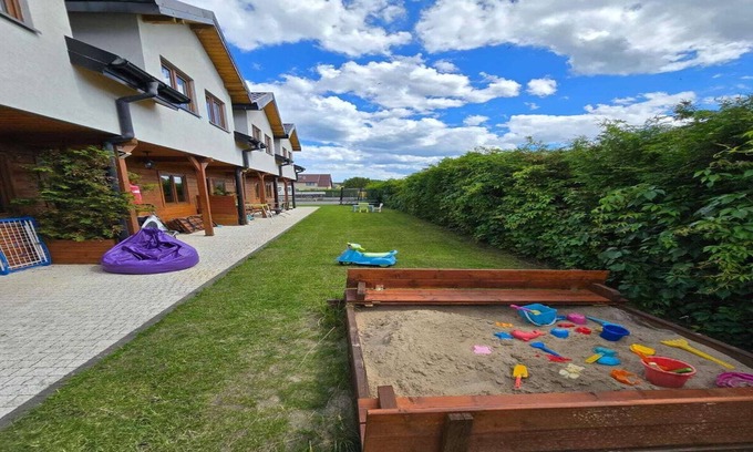 On a fenced property, approx. 650 m from the sea, 800 m from the promenade with numerous cafes and restaurants, a family holiday resort with full infrastructure awaits. The nearest restaurant and bar with homemade food are 100 m from the resort. Grocery store 200 m. Two-storey terraced holiday homes. On the ground floor there is a living room with a double sofa bed, TV and table and a bathroom with shower. The living room is connected to the kitchen. On the first floor there are 2 separate bedrooms. The cottages have the possibility of electric heating (in September). There is a terrace, where a set of garden furniture, deckchairs and barbecue equipment have been prepared for guests. Wireless internet is available. There is a parking lot and a playground for children on the premises of the resort. The price of the stay includes: bed linen, electricity and water consumption, final cleaning, internet, parking. Baby cot and high chair on request (reservation required). Sarbinowo is a small, picturesquely situated summer resort on the west coast, a few kilometres west of Mielno. Clean, wide beaches await you here, ideal for escaping the hustle and bustle of the city. It is a great place for a trip with family or friends. For families with children, the Pomerania Fun Park is a great destination for a full-day trip. On an area of over 30 ha, the whole family can spend time having fun together. In addition, there are two restaurants and numerous catering points at the guests' disposal. The international R-10 cycling trail running around the Baltic Sea basin runs a short distance from the resort. We recommend trips to the picturesque Chłopy, the centre of Sarbinowo, the lighthouse in Gąski, Ustronie Morskie.
