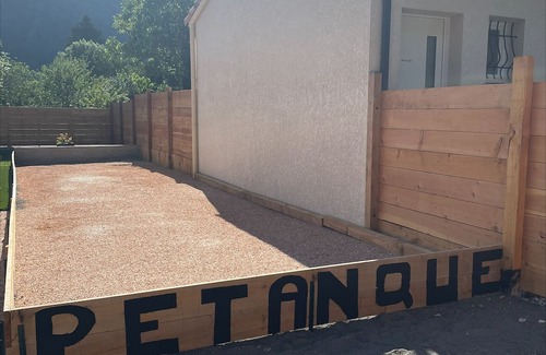 Play area with petanque pitch, table soccer, ping-pong table and children's slide