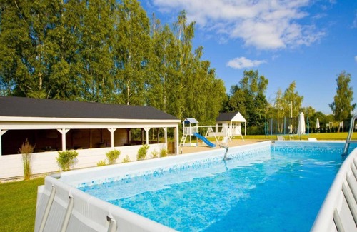 Layout: Ground floor: (open kitchen(hob, electric kettle, coffee machine, fridge), Living/diningroom(double sofa bed, TV(flatscreen), dining table), bedroom(double bed), bedroom(single bed, single bed), bathroom(shower, washbasin, toilet, hairdryer)) Barbecue center, Reception, Internet access, Parking, Balls court, Sporting field(s), Indoor playroom, Play area, Lawn, Bubble bath(shared with other guests, outside, paid, heating element), sauna(paid), washing machine(shared with other guests, paid), heating(electric), terrace(roofed), garden(shared with other guests, fenced), garden furniture, sun loungers, trampoline(shared with other guests), parasol, swimming pool(shared with other guests, outside, 6 x 3 m opened from 1/2 Jun upto and including Aug), slide(shared with other guests), bicycles available(on request), high chair, toys, Volleyball court, Garden shed, Swing set, baby crib(free)