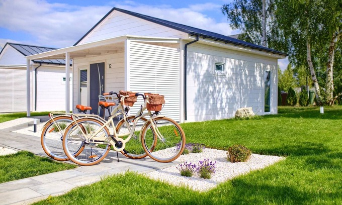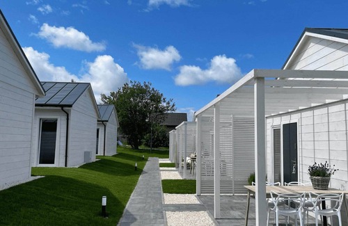 A family holiday resort with excellent infrastructure (including a swimming pool, sauna, whirlpool bath) located in a quiet area. Guests looking for the hustle and bustle and attractions typical of a larger seaside resort will find all this in the neighboring Mielno. Comfortable, single-storey holiday homes with covered terraces and a set of garden furniture. Each cottage consists of a living room (table, TV, 2-person sofa bed), kitchenette, 2 separate bedrooms and a bathroom with shower. Electric heating. Wireless internet is available. On the well-kept, fenced area of the holiday resort there is a summer swimming pool, an attractive playground, a playroom, a barbecue and bonfire area (with a large garden shelter), parking. There is a beach volleyball court. For an additional fee, you can use the sauna and whirlpool bath. There is a public washing machine (for an additional fee). The price of your stay includes: bed linen, towels, electricity and water consumption, heating, final cleaning, swimming pool, parking, internet, stay with a dog (max 5 kg). Baby cot and high chair available on request. The beautiful seaside beach is approx. 1.2 km from the resort. The international R-10 cycling trail runs in the vicinity of the resort, which allows you to easily and conveniently get to other neighbouring seaside towns by bike: Mielenko, Chłopy (a small, historic fishing village), Łazy, Sarbinowo, Gąski. In neighbouring Mielno, approx. 2 km from the resort, there is Lake Jamno with a marina, water equipment rental (pedal boats, kayaks, rowing boats). There are also fishing spots here. It may not be a particularly attractive body of water for swimming enthusiasts, but it is an ideal place for water sports (windsurfing, kitesurfing - rental and school) and for anglers.