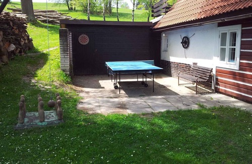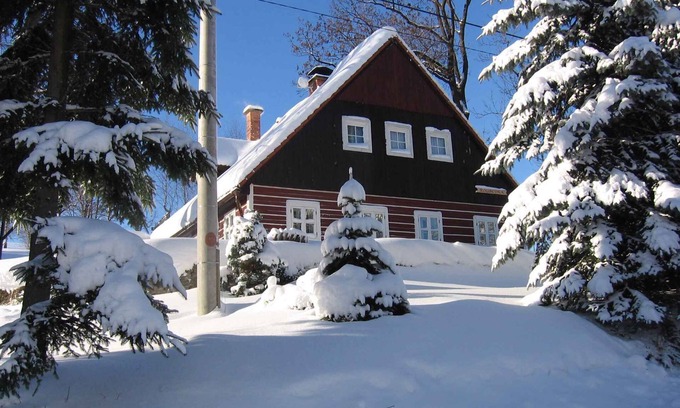 The detached holiday home. Also due to the view over a panorama from the property the domicile is popular. This property is a family-friendly accomodation. Available for your exclusive use: sunbathing lawn, parasol, children's playground, sandpit, barbecue facilities, terrace, garden furniture and campfire site. Air hockey and Russian skittlesLocationVíchová nad Jizerou, 650 m above sea level. The holiday home is located on a 1000 sqm open garden plot with meadow, flowers and shrubs. The landlord does not live in the house or on the property. House with wooden paneling. It is surrounded by 2 other FerieHäusern. The log cabin is located above the street with little traffic between Jilemnice and Roudnice. Access is directly from the main road (asphalted). Snow chains are recommended in winter. Parking (for 5 cars) is available on the property. Specialcentral heating (oil).Facilities: baby cot, internet access (WLAN), Playstation, iron, ironing board, washing machine and dryer. TV reception takes place via satellite. 250 channels. Leisuretable tennis, table football, darts and boccia / petanque. Dogsallowed, EUR 2.00/pet per day. DistancesShopping 6 km, restaurant 1500 m, town center 6 km. indoor swimming pool, sauna, discotheque, doctor, pharmacy, bank each 6 km in Jilemnice. In summer: Open air bath 6 km in Jilemnice. tennis in Jilemnice 6 km. In winter: Ski area 2,5 km (Aldrov-Vitkovice). ski rental in 2,5 km. Aldrov has 4 chairlift and Vurmovka for less advanced skiers. Further skiing: Benecko 8 km, Rokytnice nad Jizerou 10 km, Horni Misecky 15 km, Harrachov 20km. Cross-country skiing in the area. DivisionHoliday home, 2 floors, 5 rooms (including 3 bedrooms), 120 sqm, in total 11 beds, on request additionally 1 child up to 2 years in a baby cot. RoomThe entrance to your holiday home is located on the ground floor, is covered, at ground level and wheelchair accessible and leads over 1 step and the 120 sqm balcony directly into the vestibule.Ground floor: Living room with sitting area, fireplace and dining area (6 seats). Bedroom with 2 double beds. Kitchen with gas stove, electric stove (ceramic hob, 4 plates), oven, dishwasher, fridge (icebox), microwave, coffee machine, toaster and electric kettle. Cellar. Bathroom with washing machine, shower, 1 washbasin, WC, hairdryer, window and Washing gel is also included in the price. Upper floor: Common room with sitting area. Bedroom with 2 double beds and 1 baby cot. Bedroom with 1 double bed, 1 single bed and access to the terrace. Bathroom with shower and 1 washbasin. Separate toilet with dryer, 1 washbasin, WC and window. Terms of lease and pricesIncluded in the priceinternet access, parking place, electricity, water, final cleaning, bed linen, baby cot – please order at booking, Wireless Internet access. Side costs-Costs on the spot:/Obligatory:heating oil 1,60 € per liter based on usage. hand towels to bring along. local tax by local tariff.Deposit:EUR 150,-/object