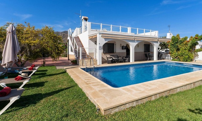 Best-rates for the Nerja house starts from $631 per night with includes Balcony/Terrace, Security/Safety, Bedding/Linens, Entertainment, Internet, Laundry, Air Conditioner, Parking, Fireplace/Heating, Child Friendly, Kitchen, Pool, Private Pool StayAndPlay offers fully equipped golf villas, golf hotels, golf resorts, luxury golf cabins, and exclusive golf retreats, making it easier than ever to find your perfect golf escape — ideal for families, peaceful getaways, or pet-friendly retreats with the whole crew.