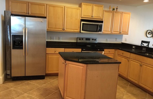 Spacious kitchen with work island, granite counter tops and stainless steel full-size appliances, fully stocked with dinnerware, high quality cookware, coffeemaker (Keurig & regular pot), blender, toaster, mixer, crock pots, air fryer, and griddle. Basic cooking ingredients, spices, kitchen linens and storage containers are provided. Cleaning products and starter paper products included.