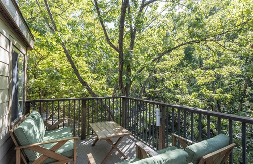 Each one is just a little bit different, but similarly the same. Walk in on the main level to find the treehouse feel in the open area, combination Living Room, Dining Room and Kitchen with views nestled in the trees and lake side. The Living Room includes a flat screen TV, wireless internet and access to the deck. Dining and Kitchen will have plenty of seating for your group and all the accoutrements of home. They include full sized refrigerator, range, microwave, dishwasher and other small appliances such as toasters and blenders. Also located on the main level is the King bedroom. This bedroom features a flat screen TV, full bathroom and stack washer and dryer.