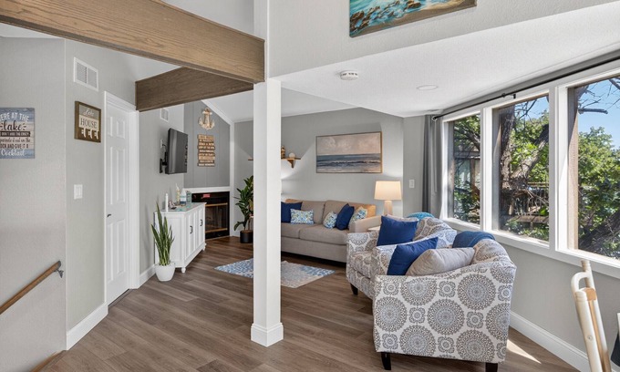 Upstairs is a loft bedroom complete with Queen bed, hanging space and a half bath. Downstairs features the last bedroom with a Queen bed, private bathroom with standing shower and small sitting deck. Living room includes a Queen sofa sleeper making this home sleep up to 8 guests.