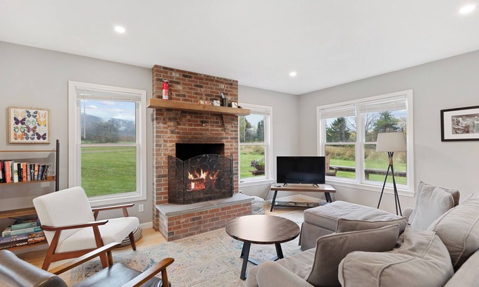 The Hollow House is set on six beautiful acres with expansive mountain views. This idyllic countryside home is just a 10-minute drive down to Stowe's historic village. Open fields give way to productive meadows and neighboring horse and cow pastures. Summertime invites you to gather around a campfire under a vast starry sky. In autumn, Vermont foliage surrounds you in all its glory. In winter, strap on your snowshoes and wind through the fields before sinking into the cozy couch in front of a toasty wood-burning fire.