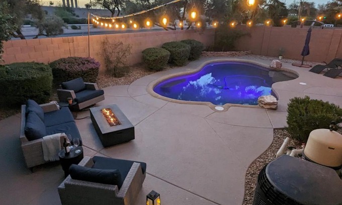 Providing a garden, HOLLYHOCK - Pet-Friendly 4BR Heated Pool & Near Golf features accommodations in Chandler. This property offers a private pool and free private parking. On clear days, guests can head outside to enjoy the vacation home's outdoor fireplace. With free Wifi, this 4-bedroom vacation home provides a flat-screen TV, a washing machine, and a fully equipped kitchen with a dishwasher and oven. Towels and bed linen are provided in the vacation home. The accommodation has a fireplace. Phoenix Convention Center is 23 miles from the vacation home, while Copper Square is 24 miles away. Phoenix-Mesa Gateway Airport is 18 miles from the property.
