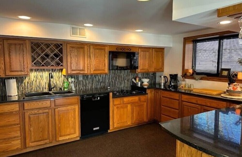 You'll have private access to the entire first floor, which includes a bedroom, bathroom, living room, and kitchen. The bedroom includes a king bed, fireplace, and blackout curtains with an adjoining bathroom and walk-in closet. The living room shares the same double-sided fireplace and has a 43” TV. The living room sofa pulls out to make a full bed with sheets, pillows, and comforter provided. There is a washer and dryer with detergent in the closet for guest use.