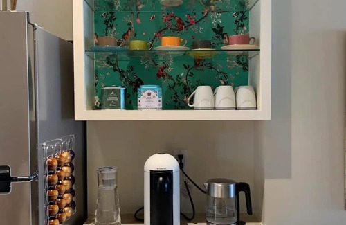 - Fully equipped with essential pots, pans, appliances, and utensils. We proudly offer Nespresso coffees and Harney & Sons teas in our caffeination station. There is a toaster and microwave.