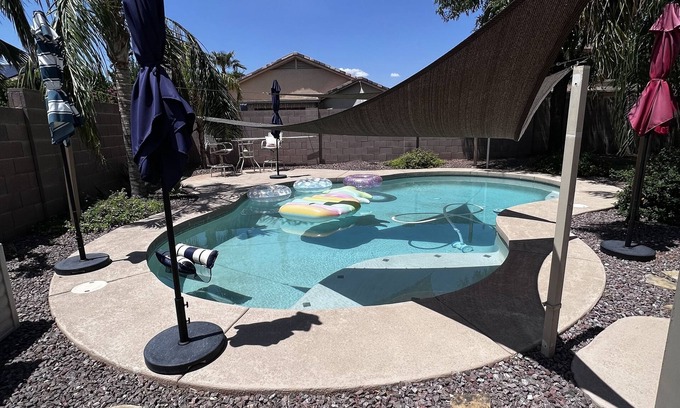 Outside is a pool with lounging chairs and canopy covers for those hot summer days in Arizona. The pool is not heated, nor is it fenced (caution for those who cannot swim, children, and the elderly).
