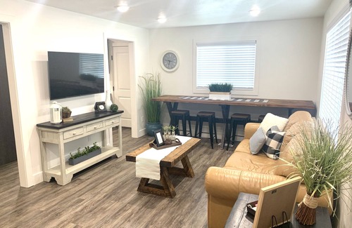 Recently remodeled and tastefully furnished in true Upscale fashion, this apartment boasts a unique charm. Includes; Stunning Modern Kitchen with keurig machine and basic cooking supplies. Spacious family room with 50 inch tv and large custom serving table. Large laundry room complete with iron and washer and dryer. 3 Cozy Bedrooms with high quality mattresses and bedding. Updated spotless bathroom with hair dryer and basic essentials. Also, a bonus vanity to help with the craziness while getting ready. Located in a very quiet neighborhood In the heart of Tremonton. Within walking distance to our local grocery stores, yummy food establishments, shopping, fairgrounds, park, splash pad, library and Museum.