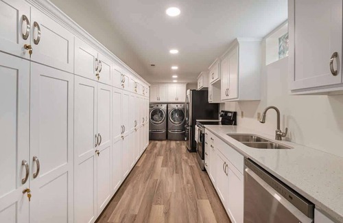 - 1st Floor: You can enter the home the either the attached garage or by way of the keyless entry on the front door. You will immediately be greeted by the open concept dining room with an high top table and living room connected. This is a great place for the family to hang out and enjoy each others company. Walking into the living room you will be greeted by a mounted 85" Smart TV, beautiful brick fire place, and a reclining leather sectional with built-in cupholders and storage space. Walking into the first kitchen of two, you will notice another dining table for four more guests to enjoy. This kitchen comes fully stocked with all the utensils you will need and all stainless steel modern appliances. On the other side of the living room you will find the first full bathroom followed by the master bedroom containing a King sized bed as well as a full bathroom. Completing the upstairs rooms is the bedroom opposite the master with a queen sized bed.