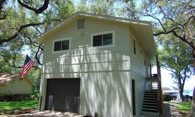 Located on a protected cove, this is a great spot to enjoy fishing, swimming and boating. The rental includes a boat dock with lift. The upstairs deck provides great views of Lake Buchanan and the lights on Buchanan Dam at night. The downstairs deck features a gas grill and offers a great place for those staying downstairs to enjoy morning coffee as the sun rises over the lake. Beautiful oak trees, a pecan and peach tree, provide plenty of shade. The larger bedroom upstairs features a king size bed while the slightly smaller guest bedroom has two twin beds. Downstairs is a separate bedroom and bath with its own air conditioning system. The downstairs bedroom has a queen size bed and a set of twin bunk beds. Damage deposit collected at booking; Sorry - NO PETS ALLOWED & NO SMOKING ALLOWED. Some of you may be wondering…why aren’t there any recent reviews? Why is the most recent review from Year 2022? Here is why. We pulled the property off of the nightly rental market when a severe drought dramatically affected our beautiful lake. The drop in the water level was so severe that there was no water under our boat dock. We felt that it was better to take it off the market than risk disappointing our guests. This is a “lake house” first and foremost, and when the lake is no longer out the back door, we knew it was time to lock it up until the drought was over. The heavy rains in central Texas in early July have filled up both Lake Buchanan and Lake Travis. Not only is there more water in the lake, the lake is completely full. So, we have re-activated our lake house and are once again accepting nightly rentals exclusively on the VRBO platform. We want to commend VRBO for supporting us in this decision and for understanding why we locked the house up for the past 3 years. It was right thing to do, and we are ready once again to accept guests. We look forward to seeing you at the lake.
