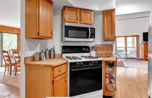 Designed for relaxation, the interior offers a warm and inviting ambiance with a pellet stove for chilly evenings. Enjoy an indoor-outdoor dining experience, perfect for taking in the peaceful surroundings. The fully equipped kitchen makes meal prep a breeze, and the home is kept impeccably clean for a comfortable stay.