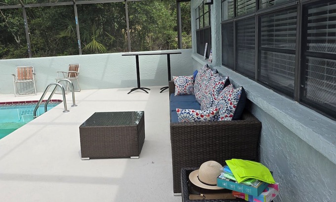 3 bedroom , daybed also available with 2 twin beds,2 bath living room,dining area,garage,screen enclosed pool, close to water park county park with beach, shopping,washer, dryer,basic essentials available, coffee, close to Crystal River, mermaid park