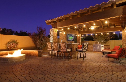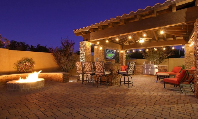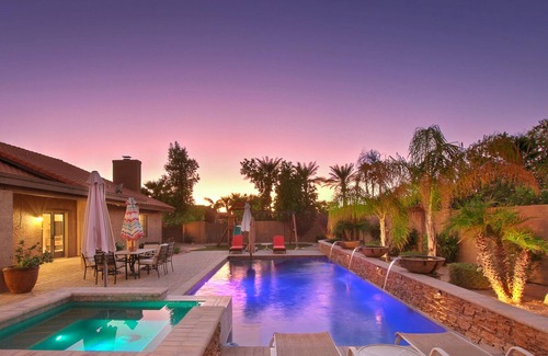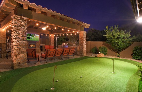 This home is conveniently located in the heart of the valley so you don't have to travel very far to get to anywhere. Or if you'd simply like to enjoy the outdoor entertainment area by throwing some meat on the grill, watching a family movie, or just relaxing by the pool all month, you're just steps away. The options for your group are endless, from the putting green, to the spa, there's something for everyone.