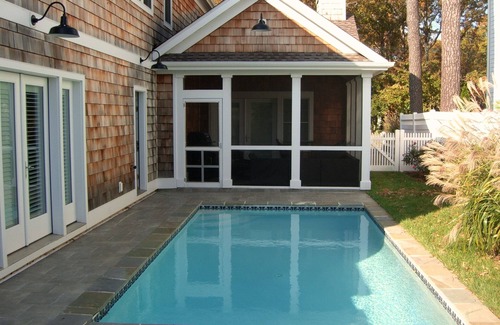 Traditional Cape Cod.. Two stories with 4 bedrooms and 3.5 baths sleeps 10. Sleek, calming interior with fenced rear yard and private pool and outdoor shower. Lovely screened porch off the living room and pool area. French doors, vaulted ceilings and plenty of light throughout. Custom plantation shutters for privacy. Tastefully decorated with upscale furnishings. Chef's kitchen is fully equipped with stainless steel and granite counter tops.