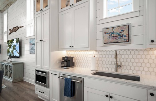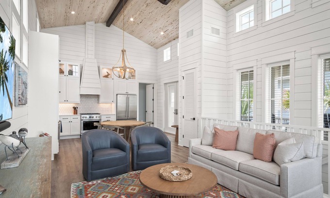 SLEEPING QUARTERS: You and your guests will feel pampered in these posh bedroom retreats, including two king suites and darling bunk room! A first-floor bunk room offers built-in twins for four, a private bathroom, and a seating area with wall-mounted TV where kids can hang out. Distressed shiplap on walls has island style, and storage nooks under beds house toys and games. In the comfortable first-floor king suite, the board-and-batten accent wall backing the bed and paneling on the ceiling signal luxury, along with fine tilework in the attached bathroom. The primary king suite on the second floor features soaring ceilings for a grand feel, along with rattan detailing, a spacious walk-in closet, and inventive, basket-weave tilework over dual vanities in the luxe, en suite bathroom.
