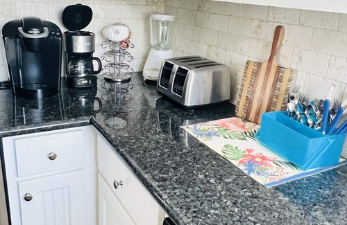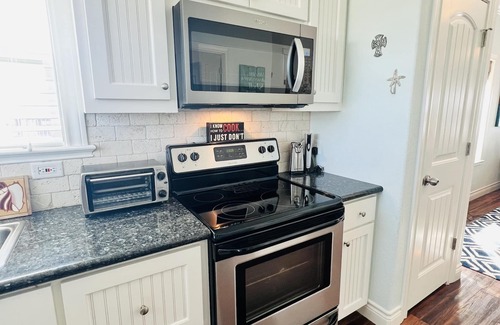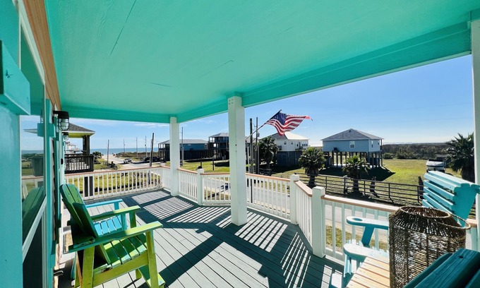 What a Cutie! Comfortable beach home that has everything you need just minutes and a short walk to the beach. This beach view home, located on an access road close to the beach, has 2 bedrooms 1.5 baths, open concept kitchen, dining, living room & a view of the Gulf from the front deck. The master bedroom has a suite 1/2 bath. Queen and full bed in second bedroom. Leather foldout electric coach that will sleep two in living room. The large main bath has shower and cabinets full with plenty of towel's and sheets. Granite countertops in kitchen and baths. Downstairs has a sand shower for rinsing those sandy feet after a day at the beach. Enjoy the Firepit for star gazing and sharing the circle of life stories. BBQ pit for cooking outside next to the built in large benched table. Downstairs sitting area with swings and rockers and a small icebox to make relaxing easier after a long hot day at the beach. Upstairs covered deck will become your favorite spot. Overlooks the beach and has wind block . Sit around the table and share the days adventures while enjoying the sounds of the waves and watching the best sunset view you will ever see. Enjoy your morning coffee overlooking the beach. Located in popular area of Crystal Beach with close proximity to shopping & restaurants. Pet friendly with non refundable pet fee, no cats please. Come stay in this little gem today fully loaded with every thing you will need!