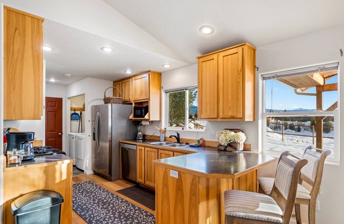 Spend your days exploring the outdoors, then come home to a cozy retreat! Conveniently located to hiking, mountain biking, fishing, and more, this home tucked amid the mountains offers ample room for your whole group to kick back and socialize. Enjoy leisurely afternoons relaxing in your enclosed backyard. The covered patio boasts a gas grill and outdoor seating for year-round barbecues, while the large grassy area provides plenty of room for lawn games.