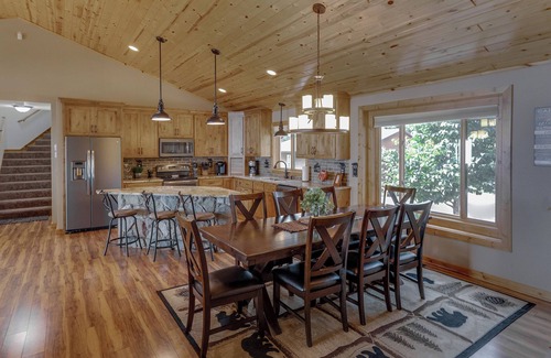 This home boasts four bedrooms and various inviting spaces, including a living room that seamlessly opens into a stunning backyard. The master bedroom offers a king bed, while the following two bedrooms feature queen beds. The spacious area above the garage accommodates four twin beds and a queen futon, complete with a TV and ample hangout space. The attached garage houses games like ping pong and air hockey. Outside, the lakeside yard presents an impressive patio for entertainment and grilling, along with a fantastic lakeside fire pit and more.