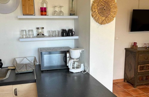 The kitchen is well-equipped for cooking up your favorite meals. Enjoy your feast around the dining table which seats 2 or outside, on the terrace.