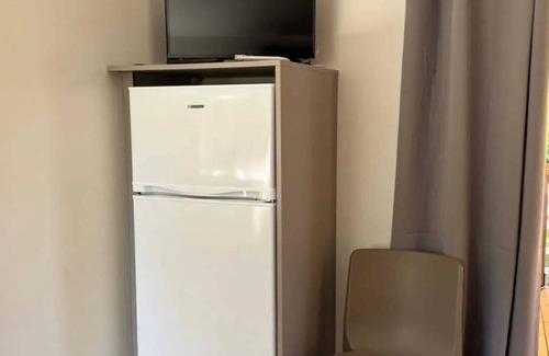Inside, you will find a welcoming living space with a comfortable sofa and a fully equipped kitchen, including a stove, refrigerator, microwave, and more. The dining table creates the perfect setting for sharing family meals. A warm and inviting atmosphere awaits you in this fully equipped accommodation, perfect for restful vacations.