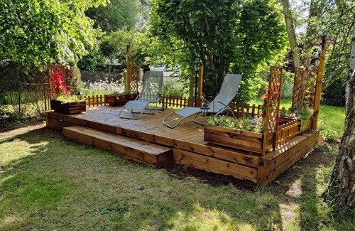 Enjoy a lovely outdoor space with a sunny terrace, perfect for al fresco meals. A barbecue is available for grilling your favorite dishes while enjoying the view of the garden and the lake. The property is surrounded by a fenced garden, perfect for relaxing moments in the sun.