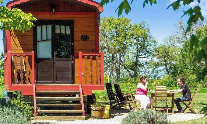 Inside, you’ll find a welcoming living space equipped with a comfortable sofa and a fully equipped kitchen for preparing your meals. The ambiance is warm with the fireplace, perfect for chilly evenings. Air conditioning ensures your comfort during warm summer days. The dining area is great for fun moments over a good meal.