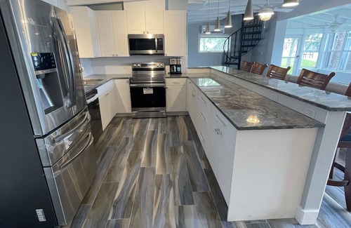 Downstairs features the Master bedroom with a king bed plus an ensuite bathroom. The full guest bathroom located downstairs has a shower. The Living Room and Kitchen have an amazing view of the Main Homosassa River. Brand New Appliances and totally renovated house will wow you. Brand New smart TV's in every room. There is a laundry room with a new washer and dryer downstairs plus a guest bathroom with a shower/tub combo.