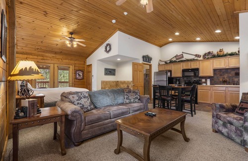 Perfect for a romantic getaway, this cozy cabin for two is set in a tranquil, wooded area but is still only minutes from Branson shows, dining, and attractions. It features a king-size bed, a seasonal gas fireplace, and a jacuzzi tub for two. The living area includes cable TV/DVD and a sofa bed. A full kitchen, dining table, and in-unit washer and dryer make it a nice option for longer stays. Free wireless internet and seasonal outdoor pool access are also included. Walk-in access with a slight step-up from the parking curb.