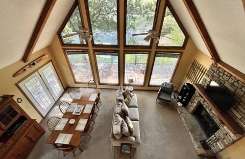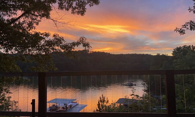 You will never forget these sunsets at Honeysuckle Point! This family/friends friendly get away that sleeps 14 starts with a large 1 acre lot and a spacious three level living space for multiple families. Great for weekend getaways, family reunions, family friends, or even a "girls" or "guys" weekend away. The main level features two bedrooms and a bath along with a spacious kitchen, open living and dining area. Just off the living area is a large deck for relaxing, grilling, and dining. The loft features a beautiful view from the office space as well as a private bedroom and ensuite bathroom. The lower level features a den, bunk room, private main bedroom and ensuite bathroom and a laundry room with access to a covered porch with lake view. You can enjoy year-round water from our double decker dock while swimming, kayaking, paddle boarding, fishing, or just sunbathing. And if you want to take a break from the water, you can enjoy the detached game room with ping pong, a swing set, basketball goal or the large front yard for volleyball, badminton, or kickball.